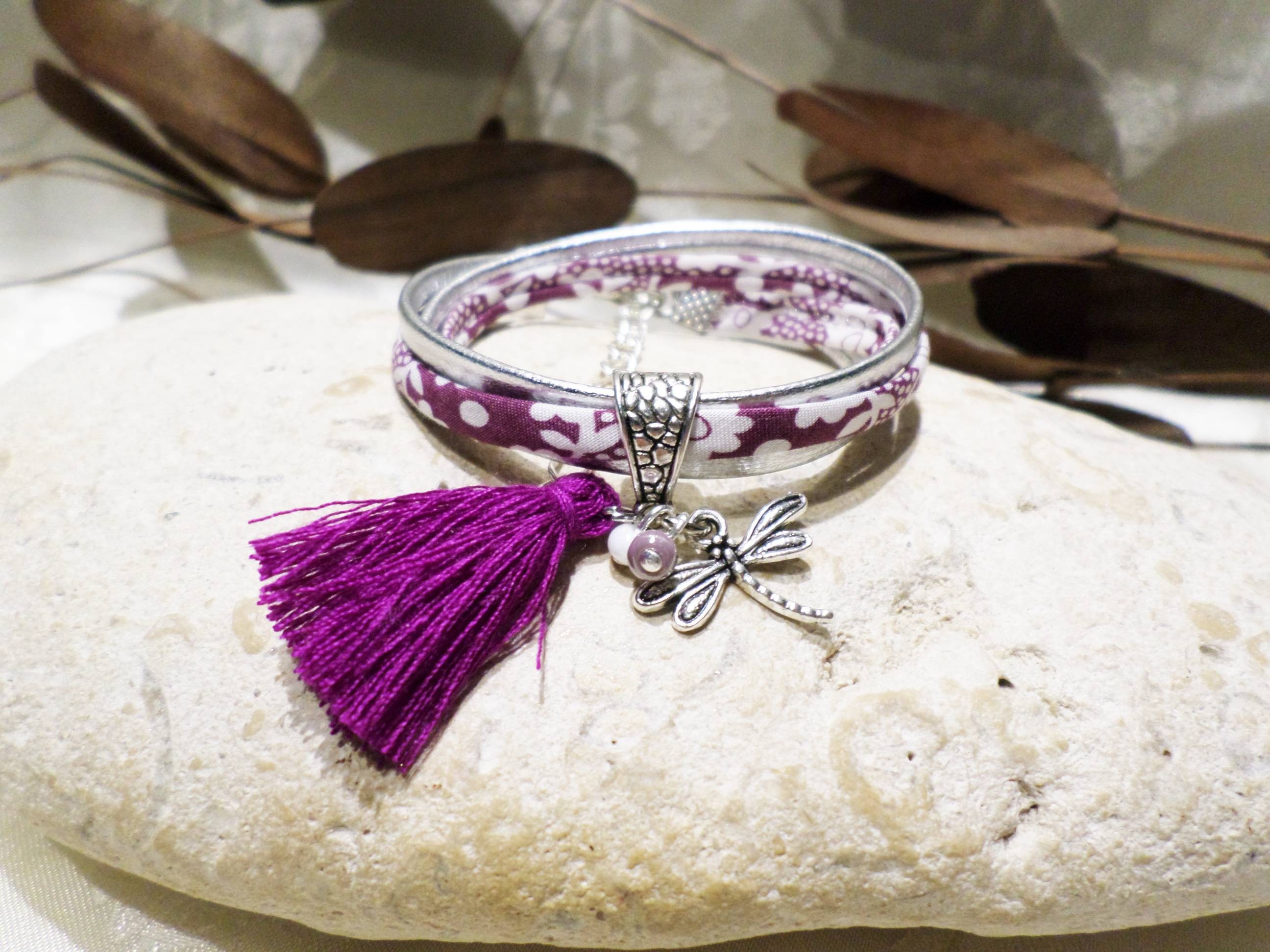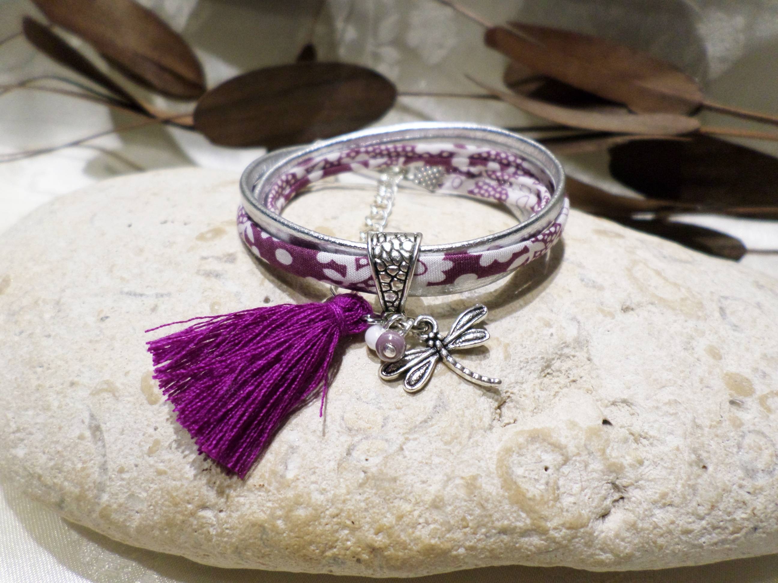 Offrez à votre petite fille ce magnifique bracelet libellule en cuir et en tissu Liberty dans les tons violet.