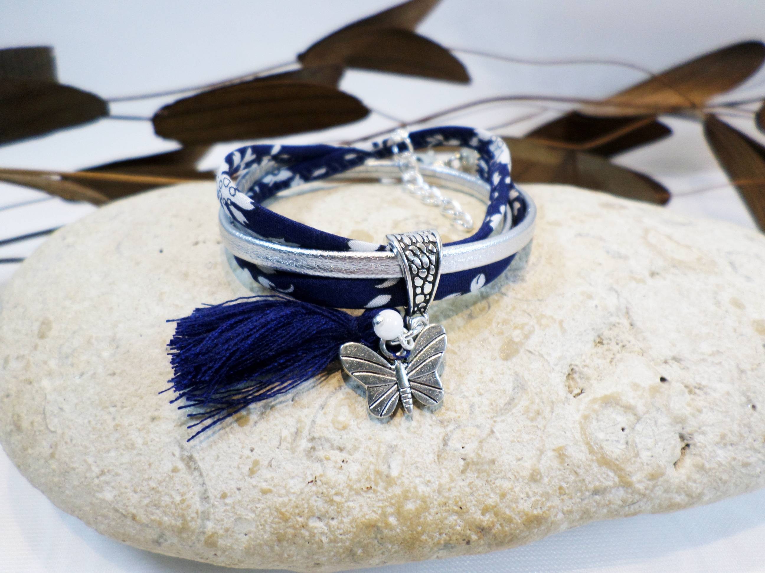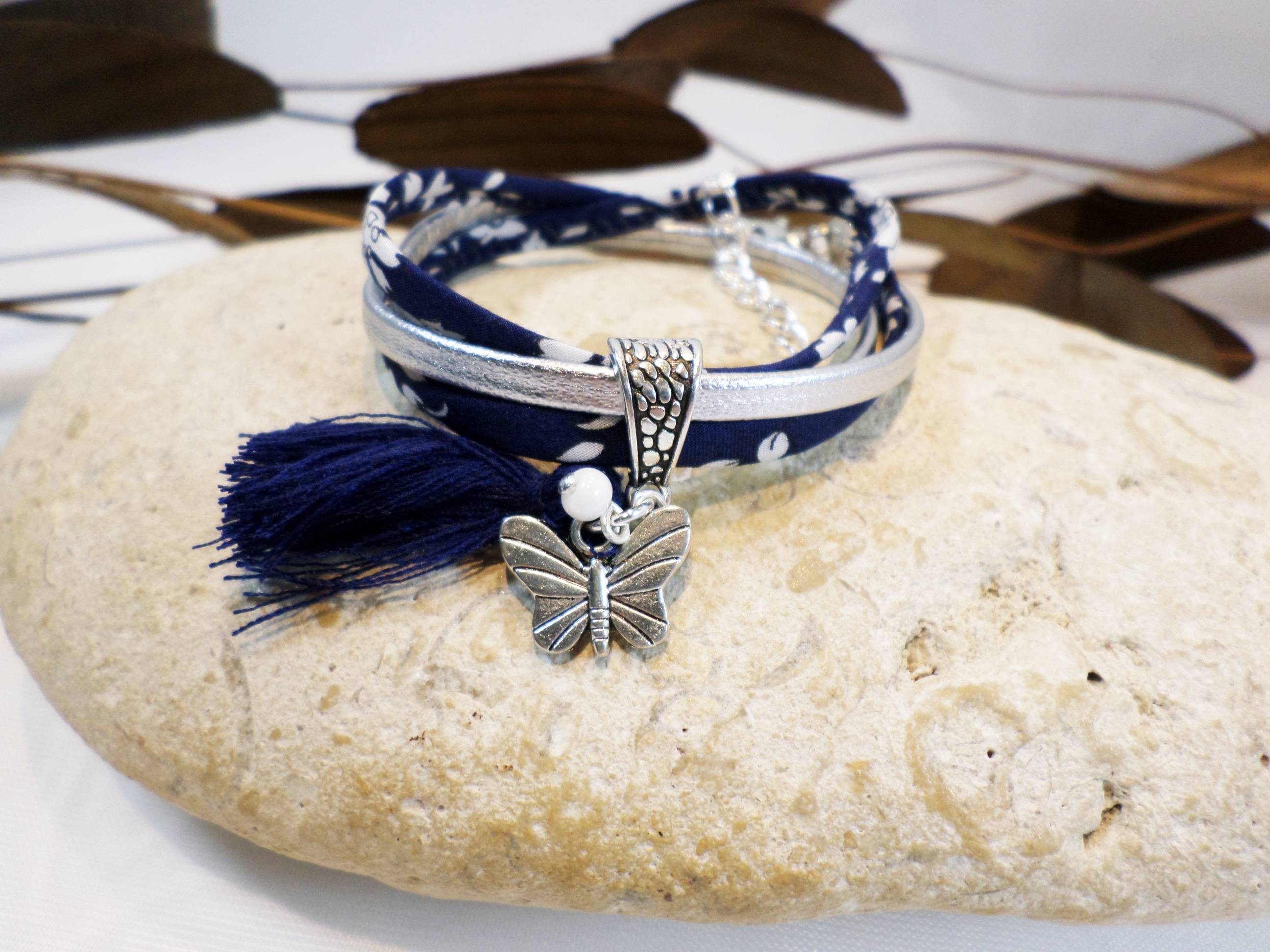 Offrez à votre petite fille ce magnifique bracelet papillon en cuir et en cordon tissu Liberty bleu marine.